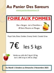 Venez profiter de notre foire aux pommes issues de notre verger partenaire Les vergers de la chenillère situé dans le Maine et Loire du 1er octobre au 02 novembre!